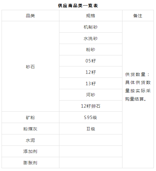 本次征集活动为2025年度第一次原材料供应商的征集,征集供应商品类为:砂石、水泥、粉煤灰、矿粉、膨胀剂、减水剂、外加剂等,现每年总需求约200万吨。